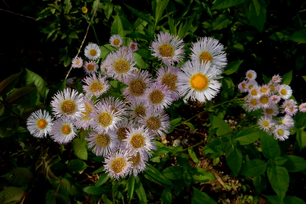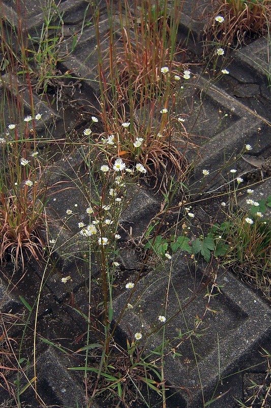 北アメリカ原産の帰化植物で道端などに生える二年草。ハルジオンに似るが、花時が遅いこと、花時に根出葉がないこと、茎に空洞がないこと、葉が茎を抱かない、蕾が垂れないなどで見分けられる。