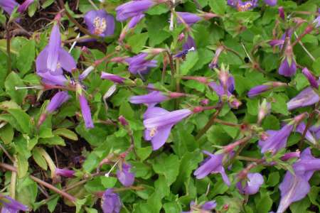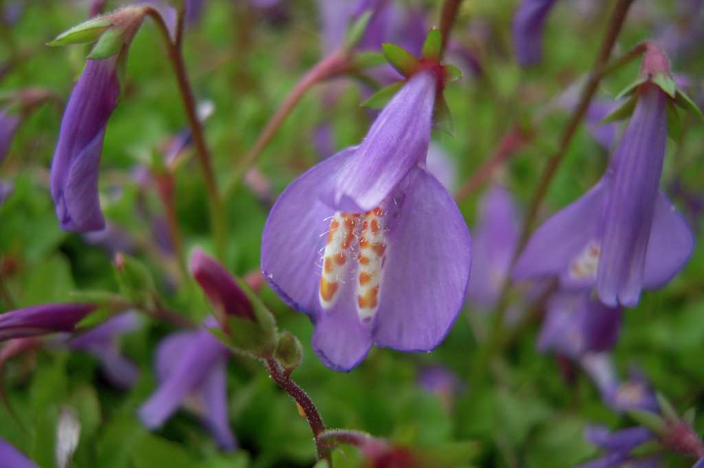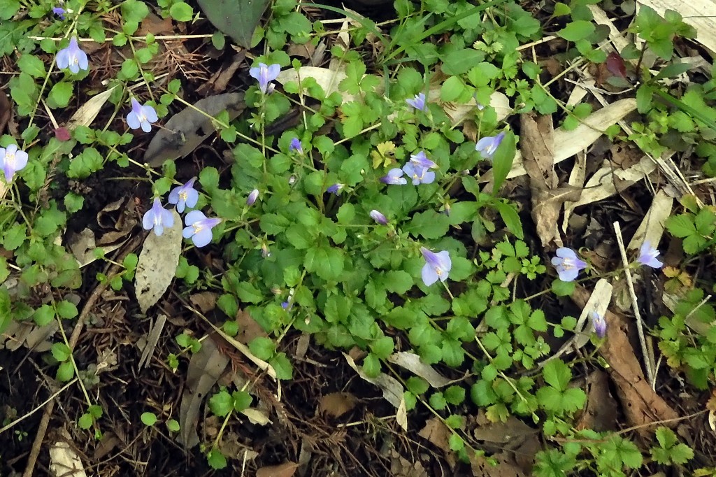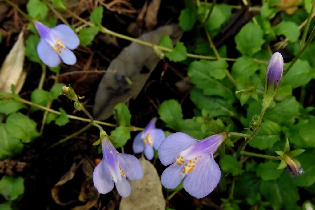 湿った道端などの日当たりの良い場所に生える多年草。匍匐茎を伸ばして地面を覆うように広がるので、時々群生しているのを見る。 花は紫色の唇弁花で中央の黄褐色の部分に毛が生えている。